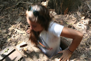 After another ride in the van we arrived at the Mekong Delta. There were bikes waiting for us. The weather was very hot. I lathered on some sunscreen which was SPF 30. Normally that goes against everything I believe in, but it's necessary around here. I am avoiding getting red like many others. The bike ride was beautiful. The smell of fresh floral surrounded us. There were banana leaves, tapioca plants, palm trees and flowers all around. At first I was a bit nervous and scared. We were riding along narrow paths that were full of potholes. The path was shared by motorbikes in both directions. When there's three or four feet of a path it gets a bit close for comfort.